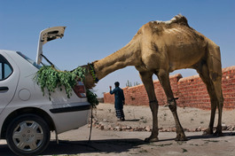 INDIA. Rajasthan. 2007. A camel feeds out of the trunk of a car....