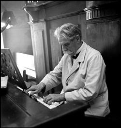 FRANCE. Alsace. 1950. Albert SCHWEITZER playing a church organ....
