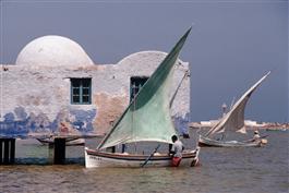 TUNISIA. Djerba island. 1990. Sailboats in the water.