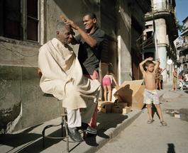 CUBA. Havana. A barber cuts a customers hair in the street. 2001....