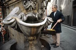 Italy, Florence: man cleaning the fountain of the Sprone of Bernardo...