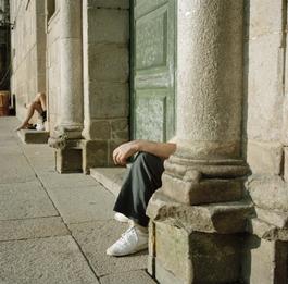 SPAIN. Galicia. Santiago de Compostela, couple sleep off a night...