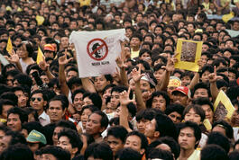 PHILIPPINES. Manila. 1986. Crowds gather outside the presidential...