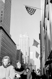USA. NEW YORK. Lower Manhatten. Bus plus the American Flag. 1962....