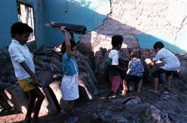 Honduras. Choluteca Children help to save tiles from the destroyed...