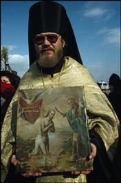 ISRAEL. Jerusalem. Russian Orthodox priest holds icon of St John...