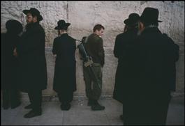 JERUSALEM. Wailing Wall. Hassidic jews and armed Israeli soldier....