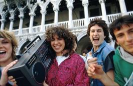 Venezia, Italia: bivacco di turisti tra le gondole.