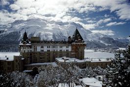 Switzerland, St. Moritz. Palace Hotel at dusk. 1959. ©Burt...