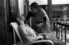 INDIA. Kerala. A tourist is given a face massage using sandalwood...
