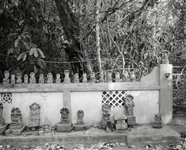 INDIA. Oachira, Kerala. Hindu priest worships a shrine of sacred...