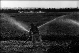 A field worker watering the crops in a kibbutz in Galilee.