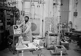 ISRAEL, 1964. Scientist at a nuclear reactor in front of a blackboard....