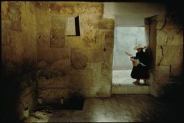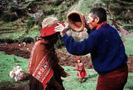 PERU. Near Cajamarca. Children prepare corn for drying. 1991....
