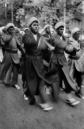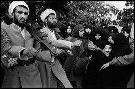 IRAN. 1980. Armed mullahs march past Ayatollah Ruhollah KHOMEINY's...