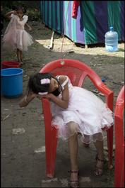 NEPAL. Bhaktapur. Young Nepali girl in colorful dress attends...