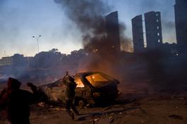LIBYA. February, 2011. Libyan youths burning cars.