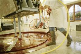 Avize: Washing the pressing machine at the Anselme Selosse champagne...